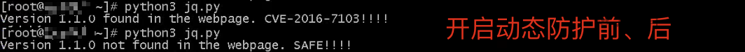 print(f"Version {version} not found in the webpage. SAFE!!!!")开启动态防护前,漏洞扫描结果存在 CVE-2016-7103。开启动态防护后,漏洞扫描结果不存在 CVE-2016-7103。