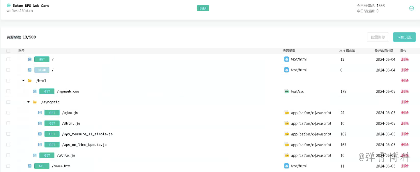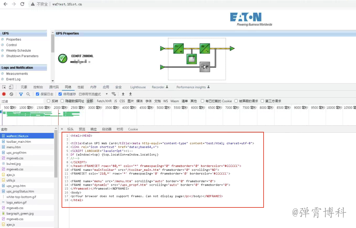 以雷池 v6.0.2 为例。测试网站是一个由 JS、HTML 以及 Frame 组成的 UPS 管理卡页面。