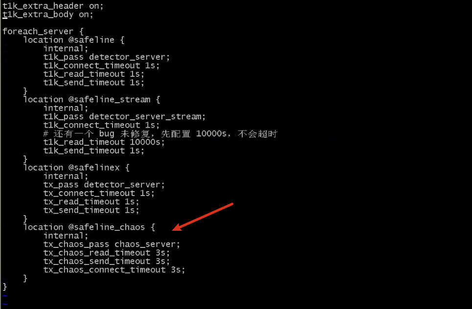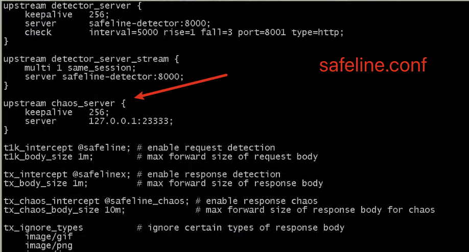 foreach_server 中增加了 location @safeline_chaos 的配置。按照 t1k 协议的定义,每个被代理网站中都会插入这段代码块。