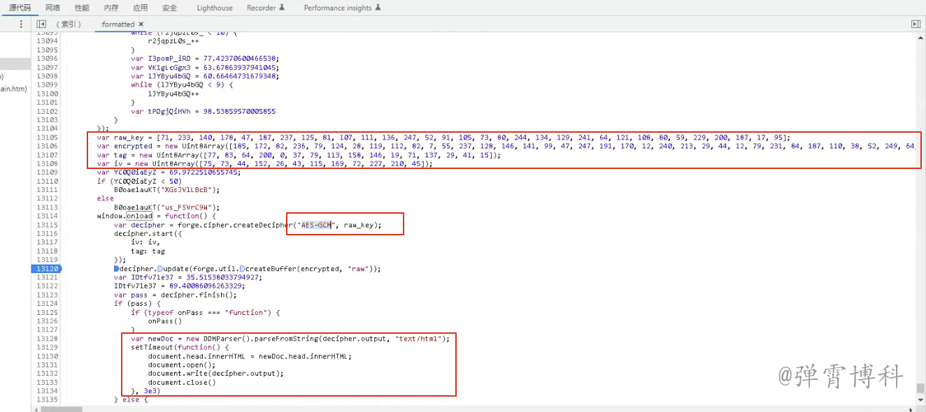 在前端代码中,定义了 encrypted(加密数据),以及 tag,raw_key 和 iv(与 AES-GCM 相关)。