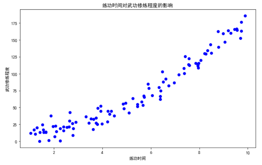plt.show()在这里,我们创建了一个包含练功时间和武功修炼程度的数据集,并通过散点图展示了练功时间对武功修炼程度的影响。