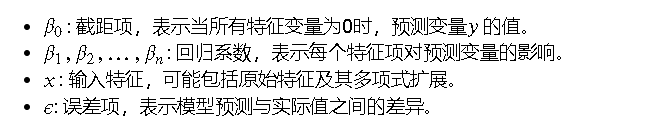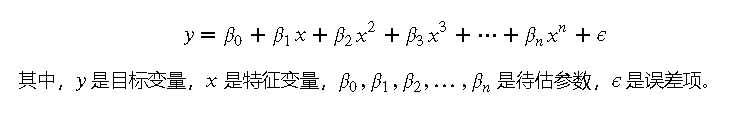 多项式回归是对线性回归的一种扩展,它通过添加多项式项来拟合数据中的非线性关系。其基本思想是将原始特征扩展为多项式特征,然后应用线性回归模型。多项式回归的方程形式如下: