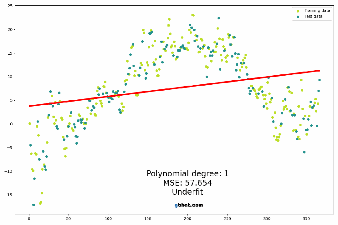 欠拟合: 欠拟合是指模型在训练数据和新数据上的表现都很差。具体到多项式回归,当多项式阶数过低时,模型无法捕捉数据中的复杂关系,导致预测效果不佳。
