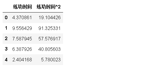 poly_features_df.head()这段代码生成了练功时间的二次多项式特征,并展示了生成的特征。