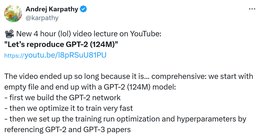 Karpathy 表示,此次视频之所以这么长,是因为它很全面:从空文件开始,最后得到一个 GPT-2(124M)模型。