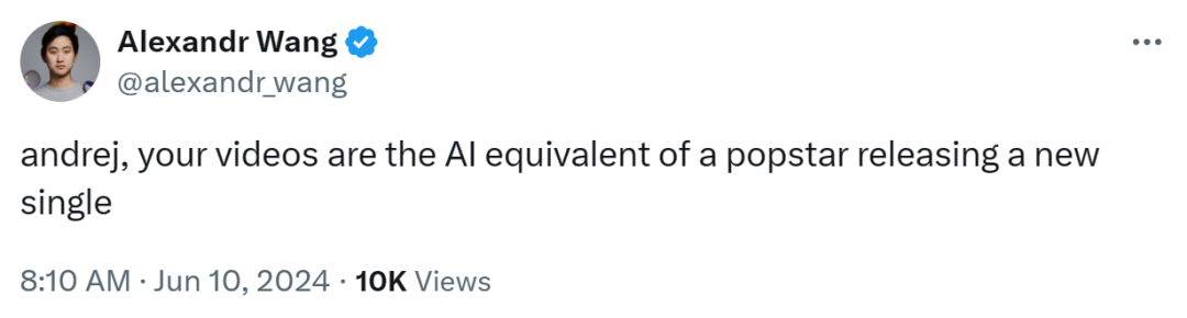 AI 独角兽 Scale AI CEO Alexandr Wang 表示,Karpathy 发布视频就像是流行歌手发布新单曲一样。