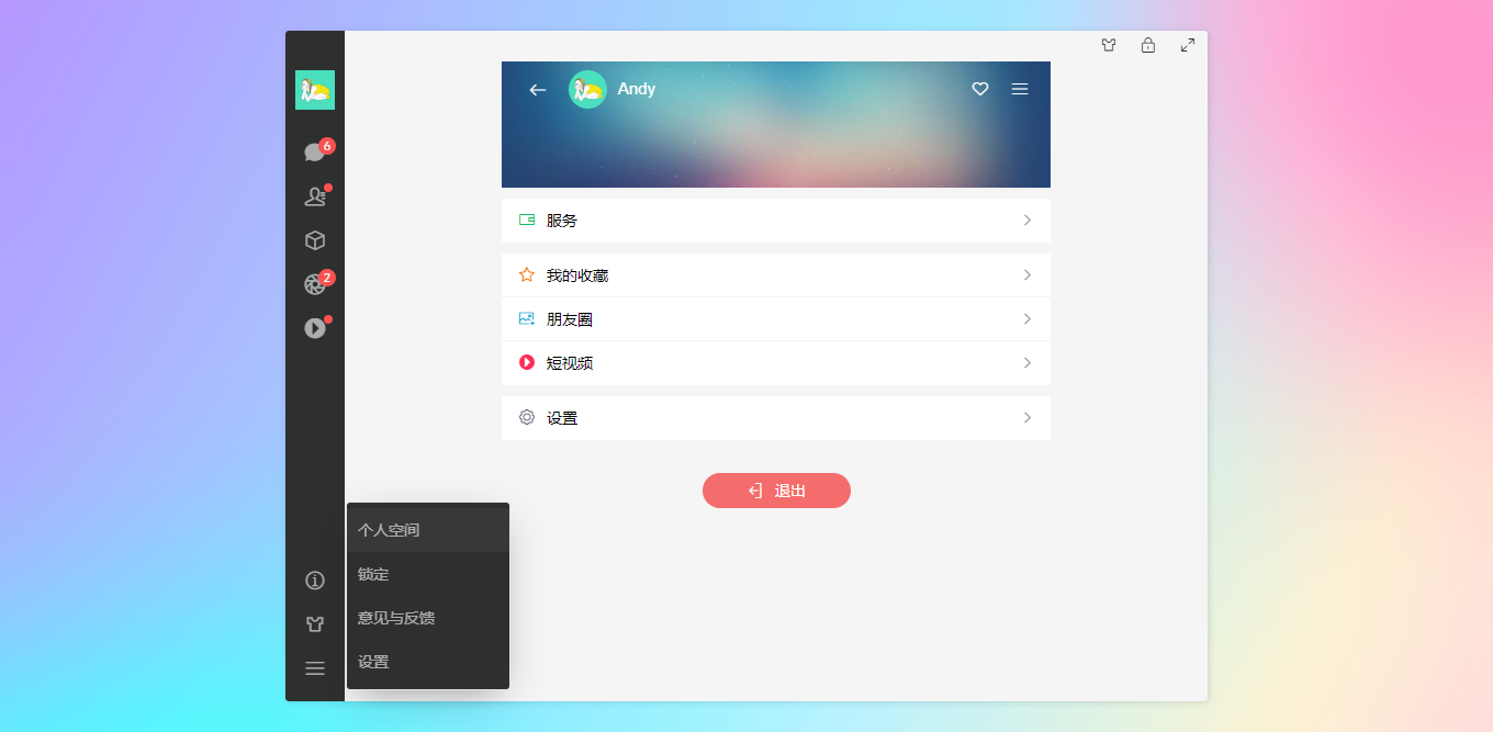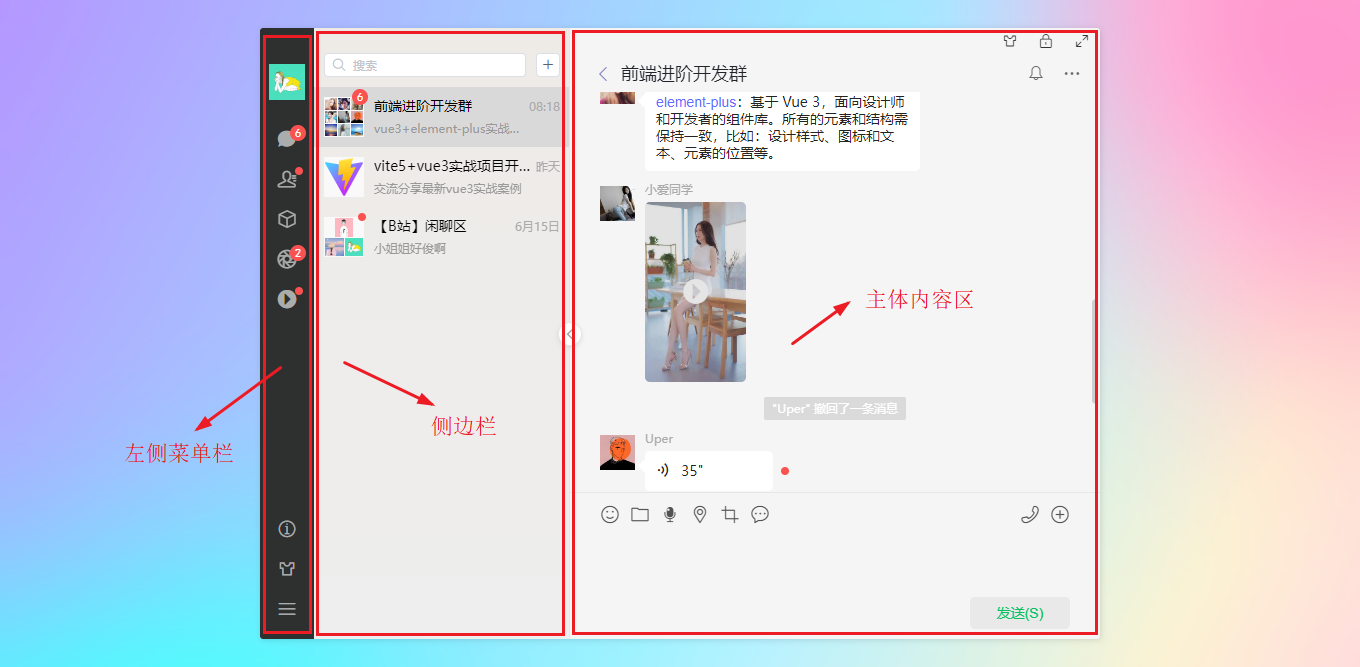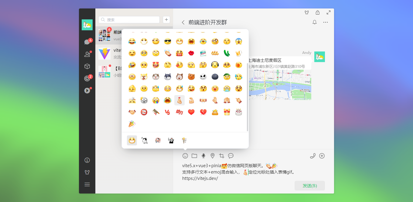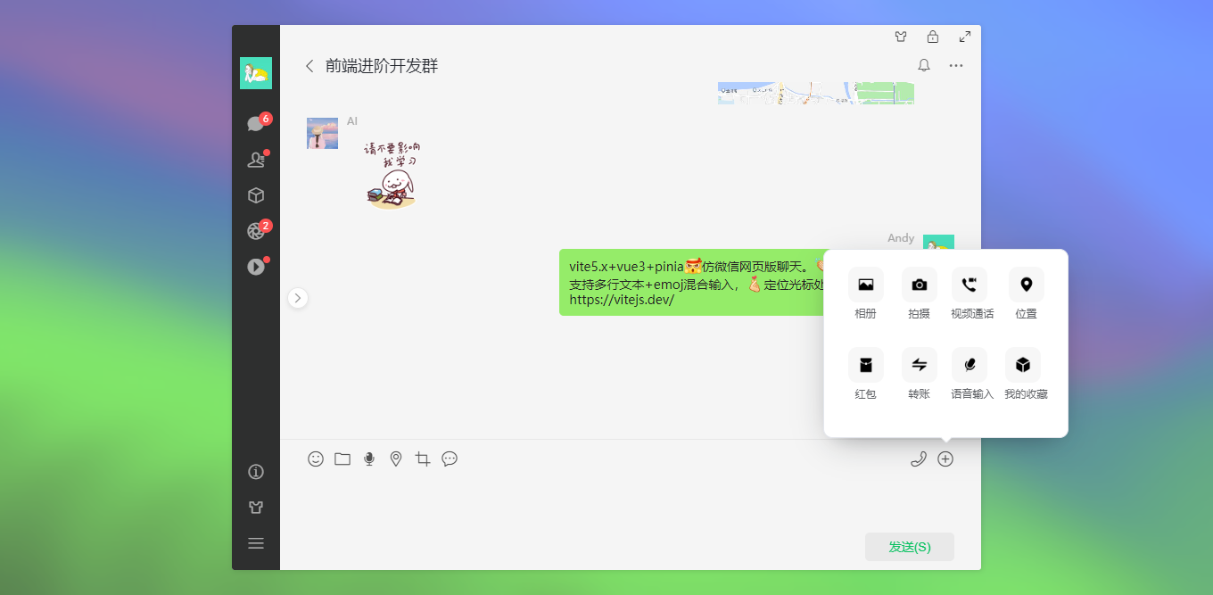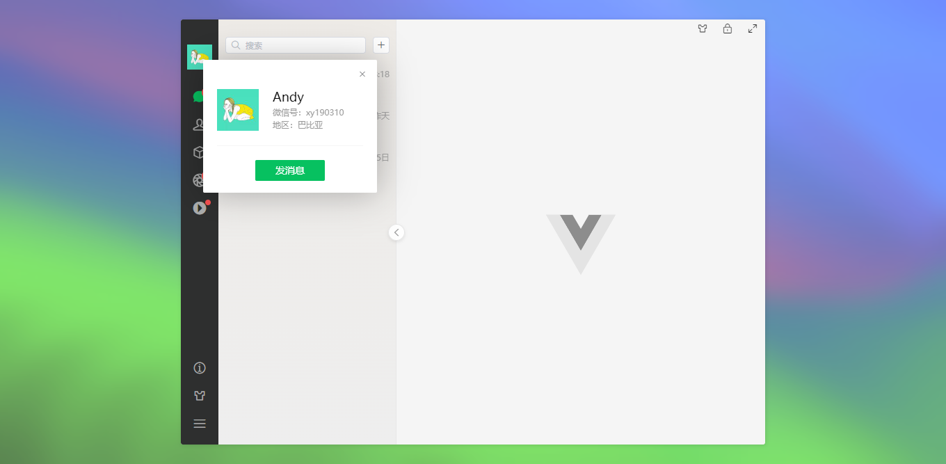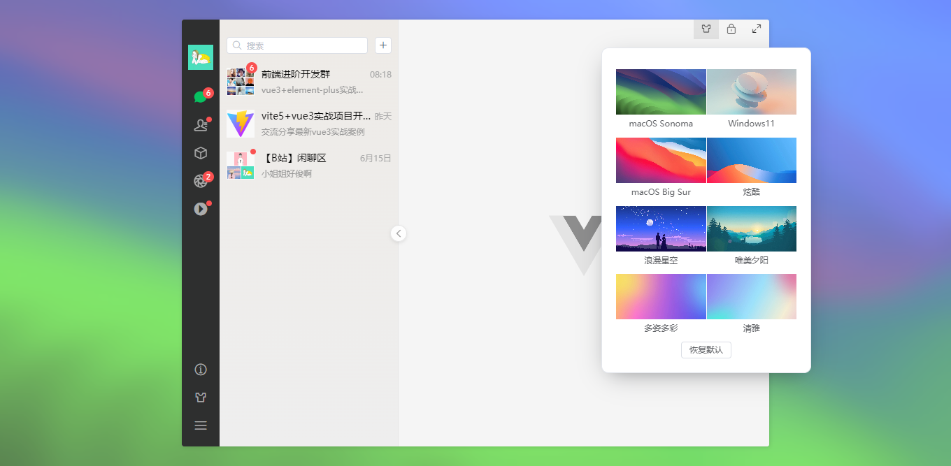 vite5-webchat 实现了聊天、通讯录、朋友圈、短视频、我的等模块。支持收缩侧边栏、背景壁纸、锁屏、最大化等功能。