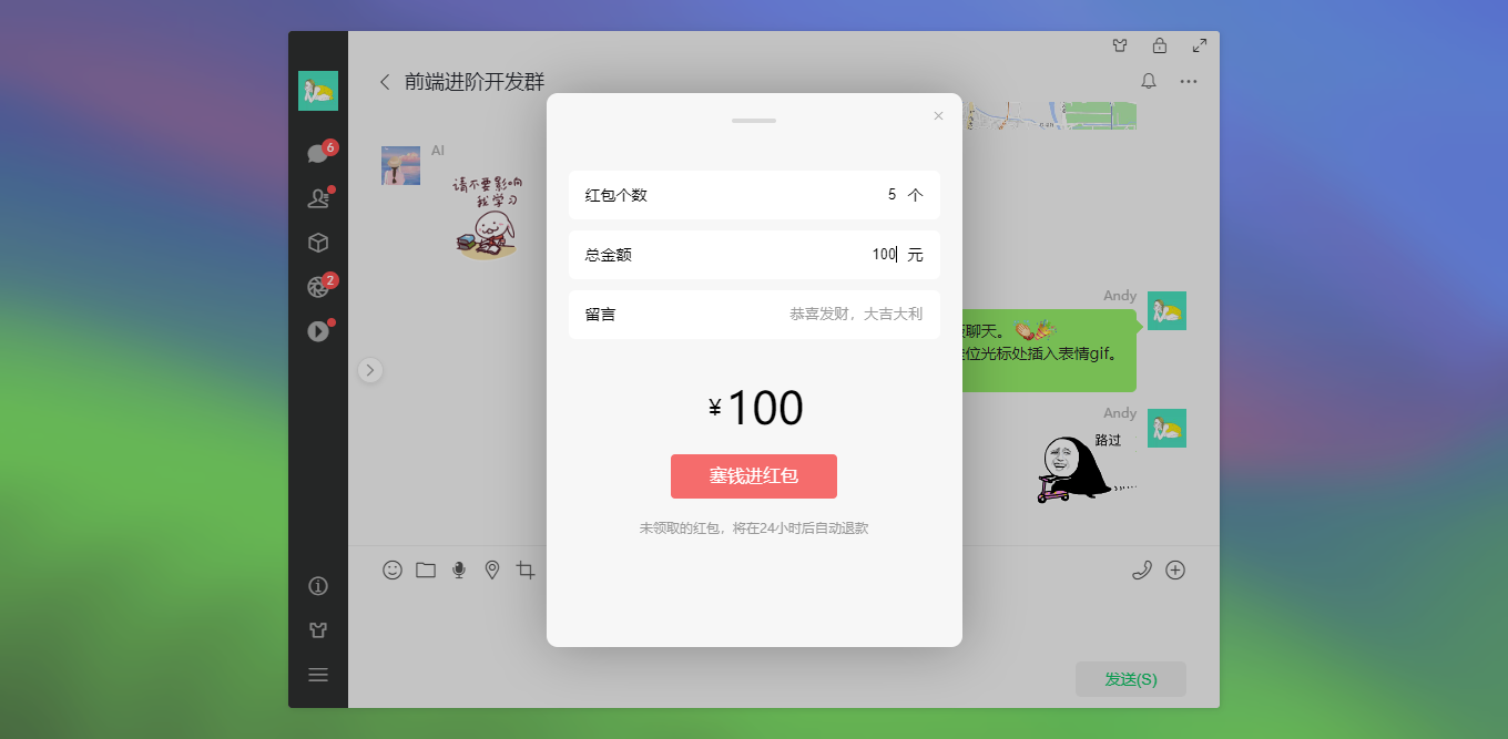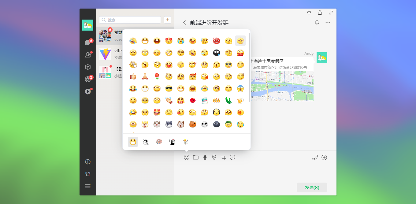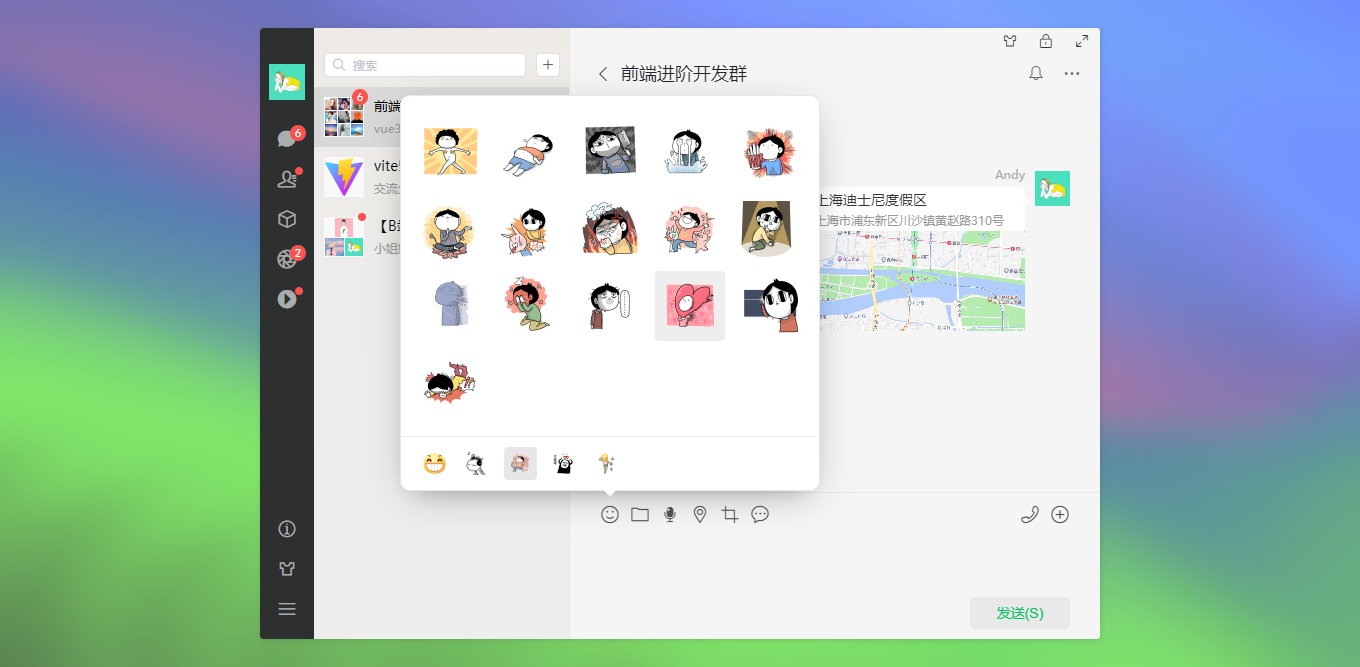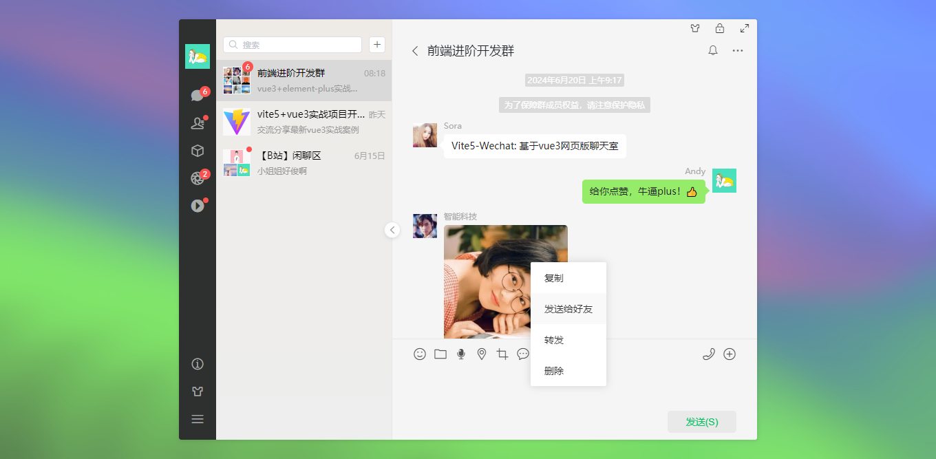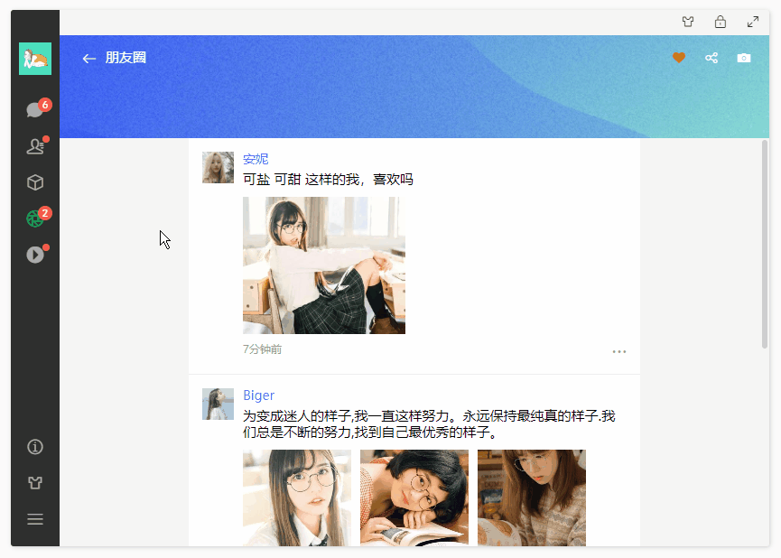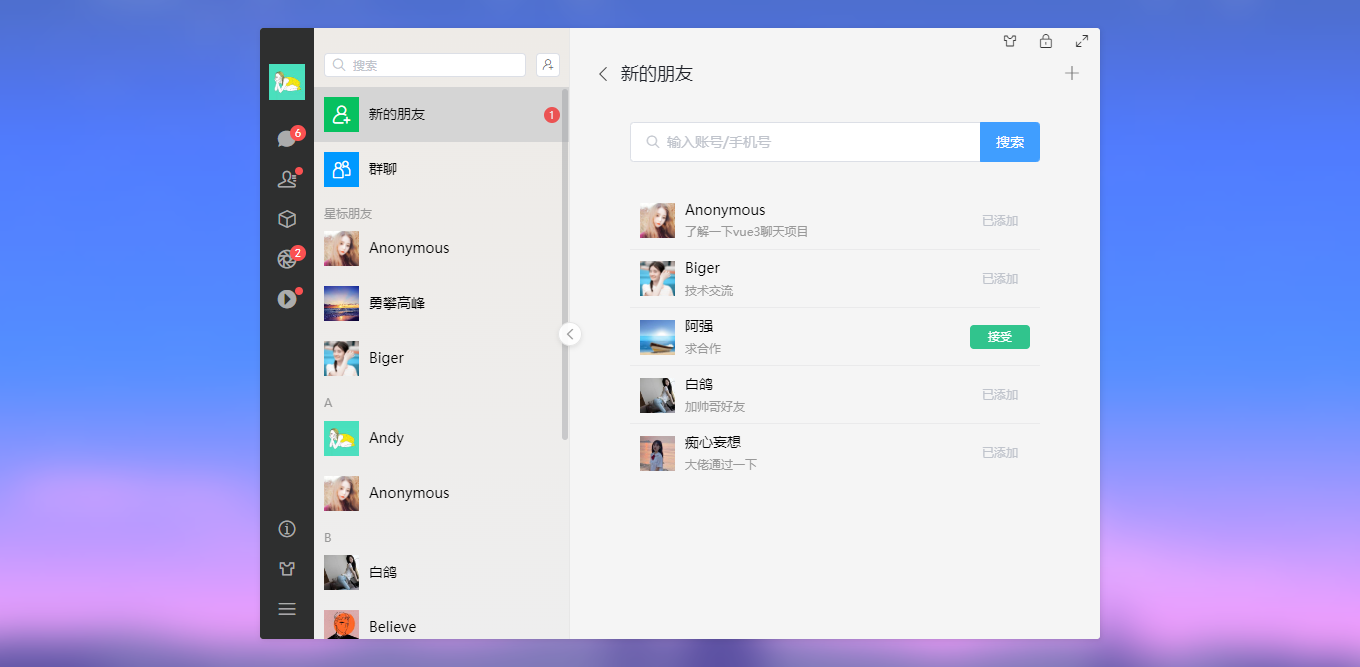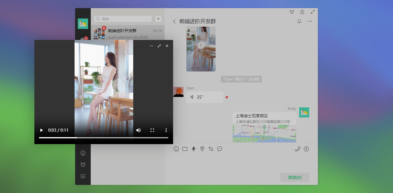 vite5-webchat 实现了聊天、通讯录、朋友圈、短视频、我的等模块。支持收缩侧边栏、背景壁纸、锁屏、最大化等功能。