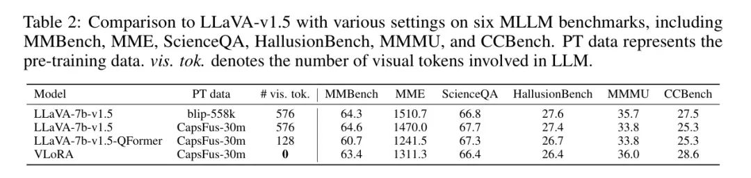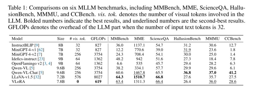 表1将作者的VLoRA与其他最先进的MLLM在六个MLLM基准测试上进行比较。结果来自OpenCompass [8]。与其它MLLM不同,作者的VLoRA在LLM推理过程中不需要任何视觉token,并且当文本长度为32时,其计算开销仅为LLaVA-v1.5的**8%**。在大多数基准测试上,VLoRA的表现超过了InstructBLIP、MiniGPT-4、Idefics-instruct和OpenFlamingo v2。与在14亿图像-文本对上预训练的Qwen-VL-Chat相比,VLoRA在MMBench上得分高出3.7,在ScienceQA上高出1.3。与LLaVA-v1.5相比,VLoRA在MMBench、ScienceQA和HallusionBench上达到相当的性能,在MMMU和CCBench上甚至表现更好。然而,在MME上的结果不如LLaVA-v1.5,因为作者的感知权重生成器是随机初始化的,在预训练阶段需要更多的图像-文本对数据。为了验证这一点,在表2中,作者通过用随机初始化的Q-Former替换投影器重新生成LLaVA-v1.5,在MME上取得了相似的结果。作者的VLoRA实现了与最先进的MLLM相当的性能,而没有将视觉token作为LLM输入,大大降低了计算开销。