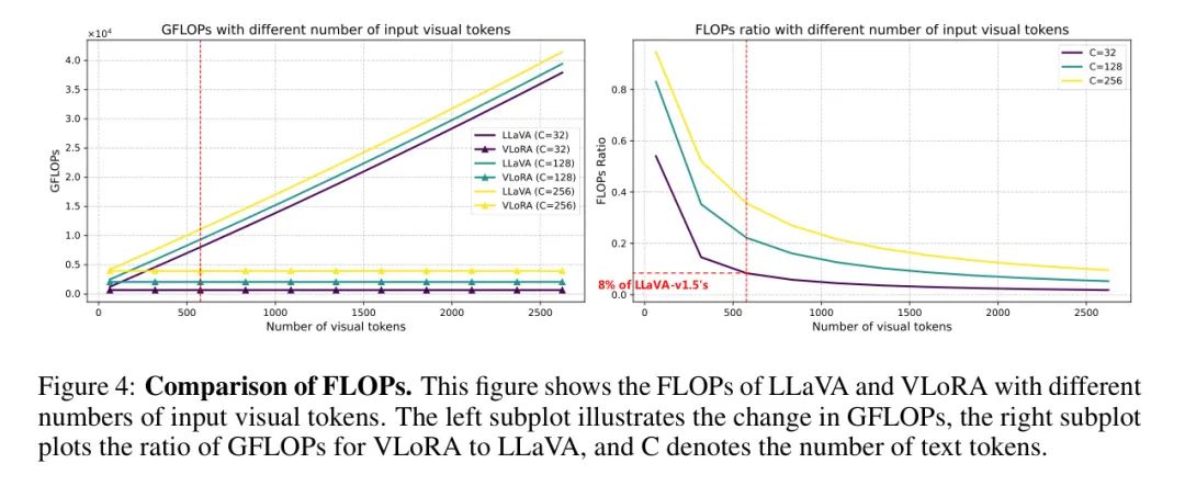 由于在LLM的输入中未引入额外的视觉标记,作者的VLoRA在训练和推理时都实现了更高的计算效率。作者只考虑LLM的计算成本,因为与LLM相比,作者的感知权重生成器的计算开销可以忽略不计。作者假设LLM有个块和隐藏状态维度为,输入文本长度为,视觉标记数量为。为了方便,作者只考虑LLM中自注意力模块和前馈网络的计算成本。自注意力模块和前馈网络的FLOPs分别是和。对于之前将视觉特征与LLM输入空间对齐的MLLM,LLM的FLOPs为。对于作者的VLoRA,额外的计算成本出现在等式(6)中,与相乘。假设作者为个解码器块中的所有5种权重生成感知权重。在训练期间,作者不将感知权重与LLM权重合并,而是将它们作为LLM权重的分支。因此,FLOPs为。在推理时,可以将感知权重合并到LLM中,FLOPs为。FLOPs计算的细节在附录A中。与推理相比,训练的开销略有增加,作者通过训练FLOPs进行比较。在图4中,作者比较了LLaVA和VLoRA的FLOPs。作者的方法不会随着视觉标记数量的增加而引入额外的计算,并且当文本长度为32时,作者的FLOPs仅为LLaVA-v1.5的8%。