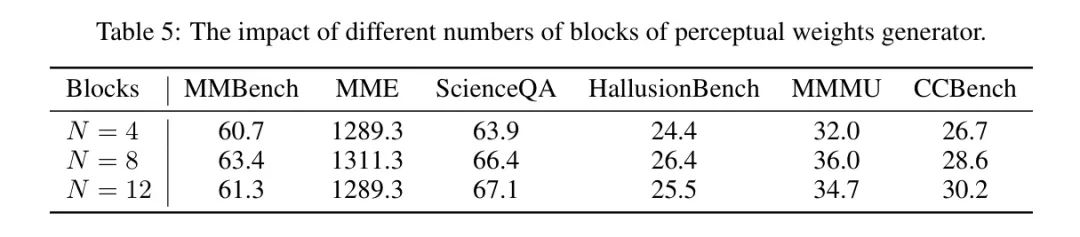 感知权重生成器的块数。为了探索感知权重生成器的影响,作者进行了不同块数的感知权重生成器的实验。在表5中,作者观察到8块权重生成器的性能优于4块。然而,当时,ScienceQA和CCBench的分数高于8块,但在其他基准测试上的性能下降。这表明虽然更强大的感知权重生成器可以实现更好的性能,但在达到阈值后增加块数并没有好处。