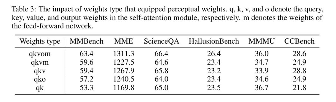 表3:配备感知权重的权重类型的影响。q、k、v和o分别表示自注意力模块中的 Query 、键、值和输出权重。m表示前馈网络的权重。