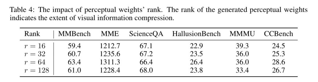 感知权重的秩。生成感知权重的秩表示视觉信息压缩的程度。秩越小,视觉信息压缩得越多。作者在表4中比较了秩从16到128的性能。当时,在感知权重中视觉信息被严重压缩。然而,具有这种低秩感知权重的LLM仍然可以感知视觉信息。从到,随着秩的增加,MMBench、MME、HallusionBench和CCBench的性能有所提高。具体来说,MMBench的分数从57.6提高到63.4,MME的分数从1163.8提高到1311.3。当秩达到128时,VLoRA在这些基准测试上的性能下降。这可能是因为视觉信息变得冗余,且较大的秩可能会在感知权重中引入噪声,这损害了LLM的能力。