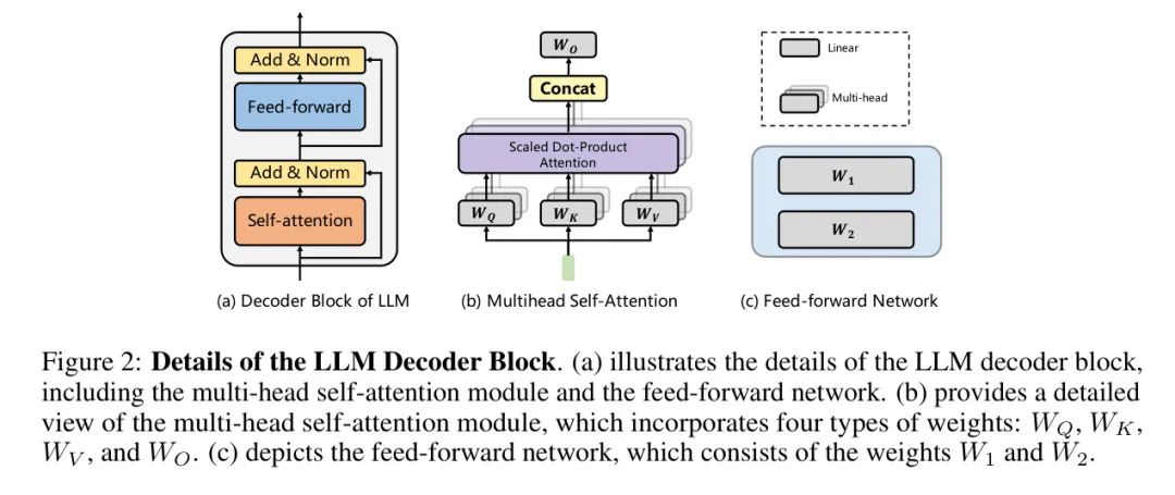 其中是输入标记,是激活函数,和是两个全连接层的权重。总之,LLM的解码器块有五种类型的权重,包括自注意力模块中的、、、以及前馈网络中的、。