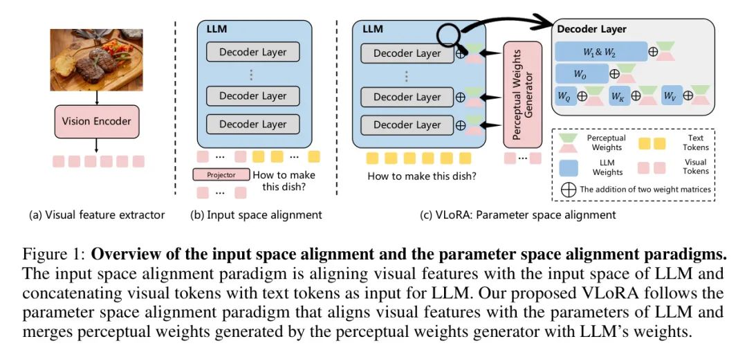 为了解决这个问题,作者探索了一种新颖的参数空间对齐范式,其中视觉信息被表示为LLM的权重。如图1所示,对于输入图像,作者使用视觉编码器提取视觉特征。然后,将视觉特征转换为感知权重,这些权重将视觉信息表示为模型权重。感知权重可以直接与LLM的权重合并。因此,视觉信息以权重形式合并到LLM中,消除了LLM输入中视觉标记的需求,显著提高了效率。基于这一范式,作者引入了VLoRA,其中包含感知权重生成器。感知权重生成器旨在将视觉特征转换为感知权重。LLM通常包含大量参数,为了可行性和效率,感知权重被设计为具有低秩属性。因此,生成的感知权重类似于LoRA权重的形式。