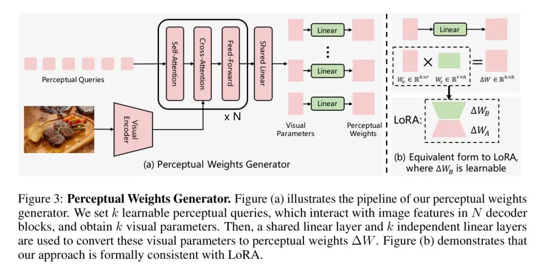 为了将视觉特征转换为感知权重,作者提出了感知权重生成器。由于LLM中的每个层和每种类型的权重都关注不同的视觉信息,作者的感知权重生成器需要能够灵活地生成对应于LLM每种权重的权重。