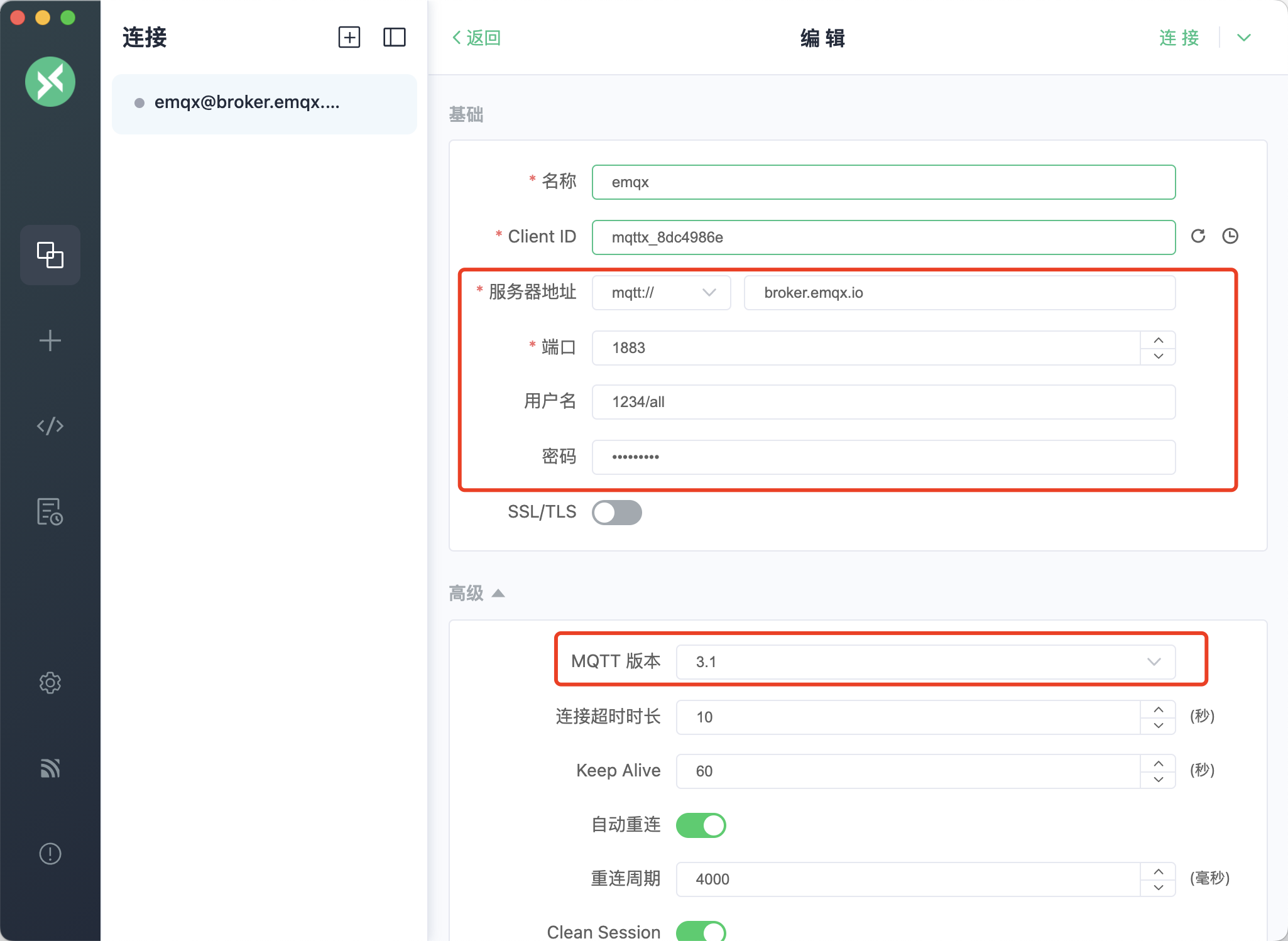 注意配置,mqtt版本选3.1。 域名和端口都要和NA111配置一致。