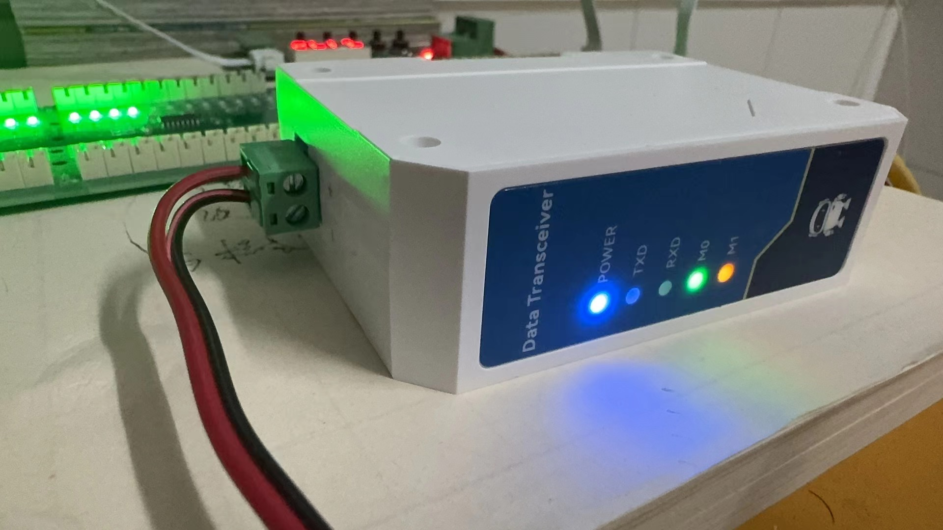 设备支持8V~28V直流电压,我们使用12v的电源给他供电,接好电源后 电源灯会亮起。
