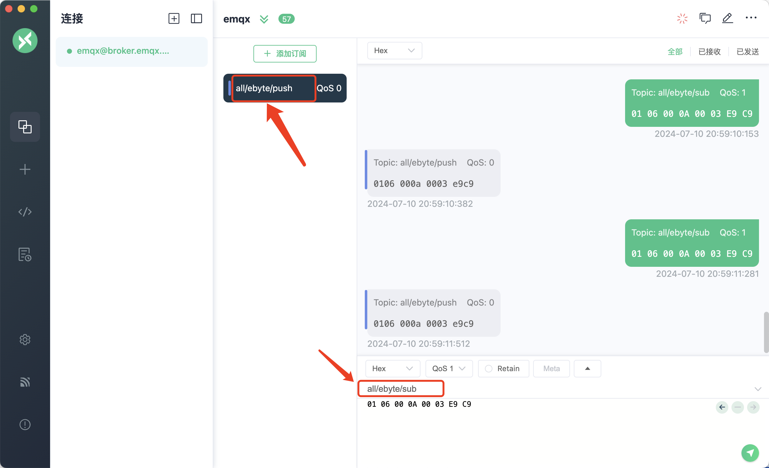 这里还需要注意,接受和发布的消息格式都需要 为HEX,16进制。