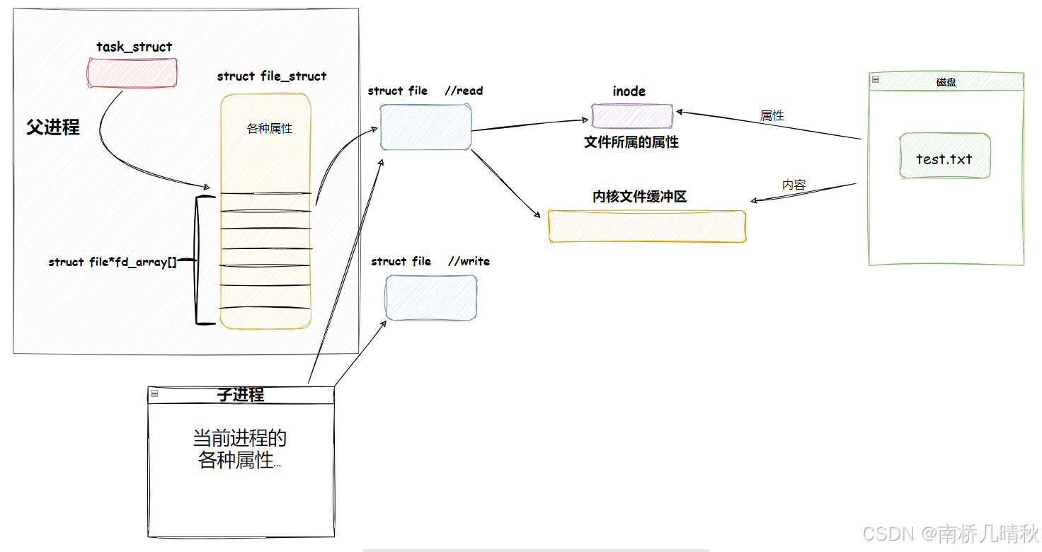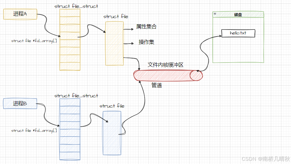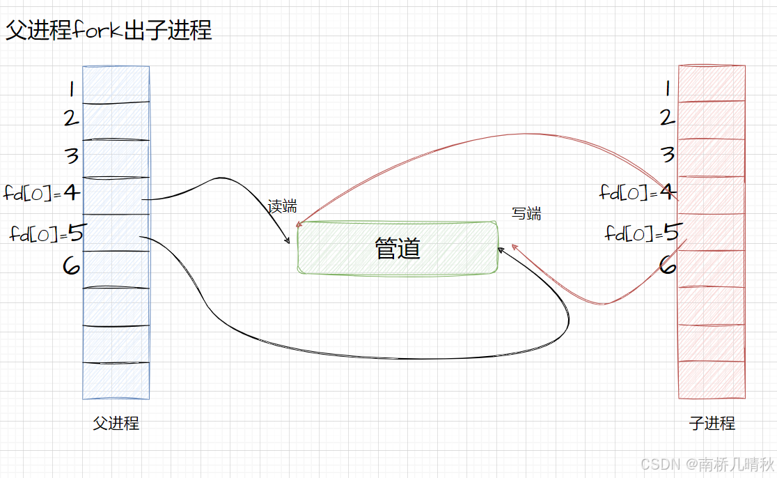 首先父进程以读写方式分两次打开一个文件,分两次的原因是为了获得两个 struct file 对象,这样对一个文件就有两个读写指针,让读写操作使用各自独立的指针,这样读写之间就不会相互影响。读写指针记录了当前文件读取或写入的位置,一个 struct file 中只有一个读写指针,在向文件写入(或读取)的时候,读写指针会发生移动,然后再去读取(写入),此时读写指针已经不再最初的位置,无法将刚写入的内容读取上来,因此这里需要分两次以不同的方式打开同一个文件。接着创建子进程,子进程会继承父进程中打开的文件,也就是继承父进程的文件描述符表,此时父子进程就会共享同一个文件资源,子进程可以通过4号文件描述符向文件中进行写入,父进程就可以通过3号文件描述符从文件中进程读取,此时父子进程就实现了数据传输,也就是通信。父子进程看到同一段内存缓冲区,这里我们称之为管道文件。管道只允许单向通信,因为简单。