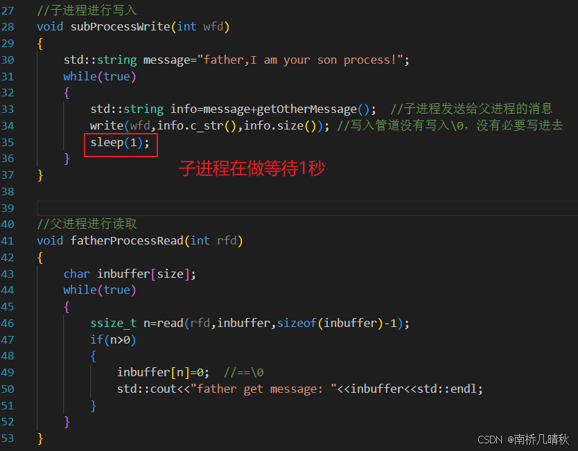 fatherProcessRead(int rfd)函数用于父进程,它不断地从管道 (rfd) 中读取消息并输出到控制台
