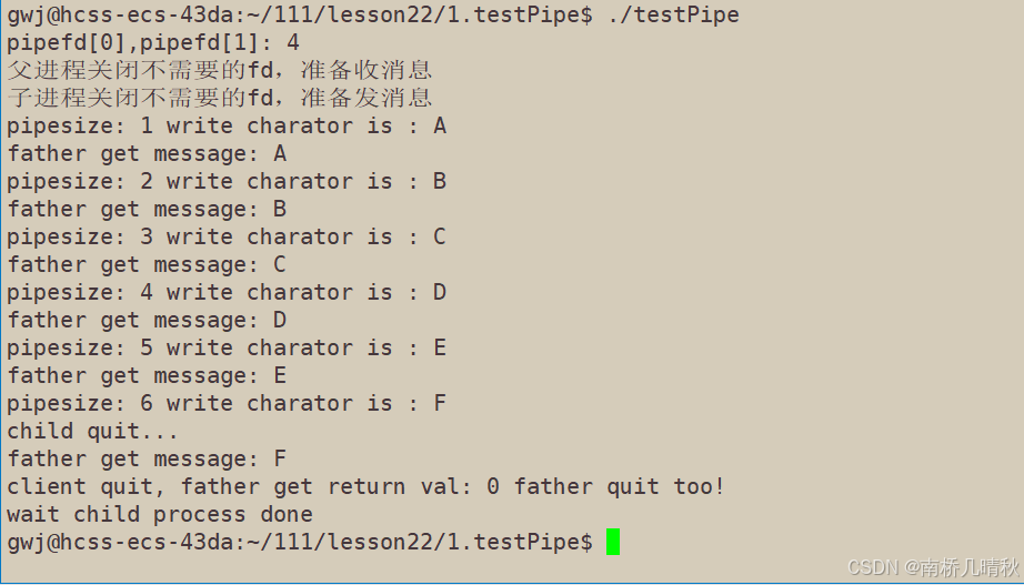 父进程关闭不需要的管道写入端 (pipefd[1]),调用 fatherProcessRead() 接收消息,然后关闭读取端 (pipefd[0])。