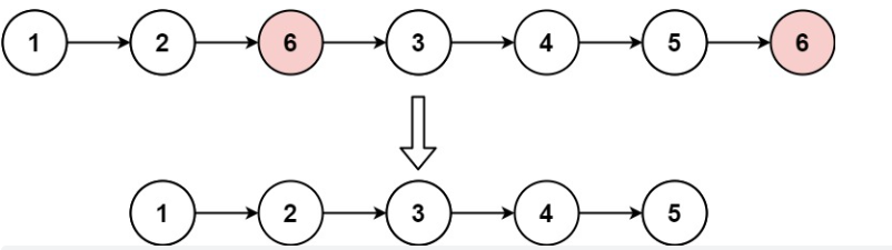 输入:head = [1,2,6,3,4,5,6], val = 6 输出:[1,2,3,4,5]