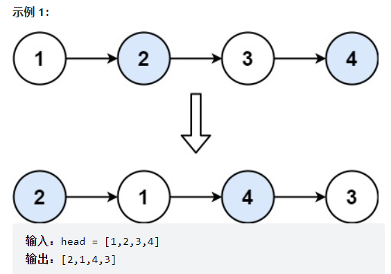 };力扣链接:https://leetcode.cn/problems/swap-nodes-in-pairs/ 给你一个链表,两两交换其中相邻的节点,并返回交换后链表的头节点。你必须在不修改节点内部的值的情况下完成本题(即,只能进行节点交换)。