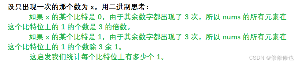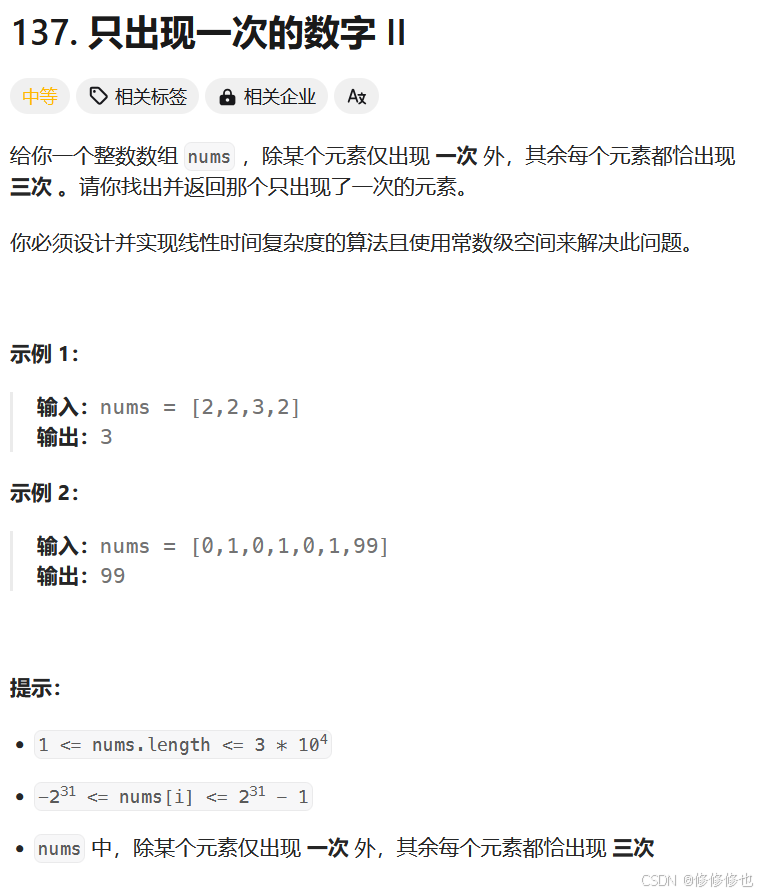 nums,除某个元素仅出现 一次 外,其余每个元素都恰出现 三次 。请你找出并返回那个只出现了一次的元素。 你必须设计并实现线性时间复杂度的算法且使用常数级空间来解决此问题。