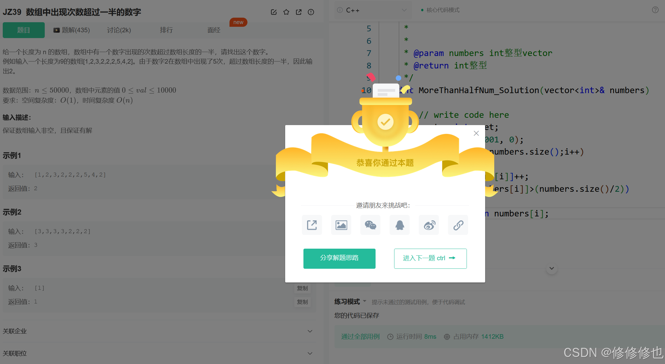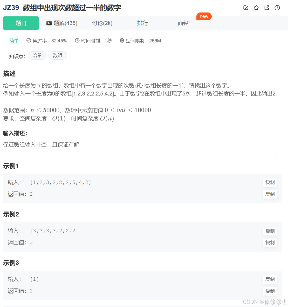 给一个长度为 n 的数组,数组中有一个数字出现的次数超过数组长度的一半,请找出这个数字。 例如输入一个长度为9的数组[1,2,3,2,2,2,5,4,2]。由于数字2在数组中出现了5次,超过数组长度的一半,因此输出2。 数据范围:n≤50000,数组中元素的值 0≤val≤10000 要求:空间复杂度:O(1),时间复杂度 O(n)