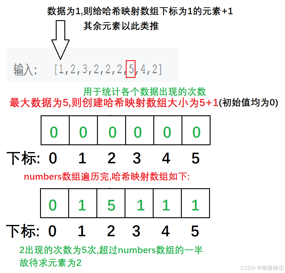利用哈希的思想,创建一个数据范围内大小的vector,用于 统计各个数据出现的次数.然后遍历数组numbers,每遍历一个数据就给其对应哈希映射的对应数据+1,然后 判断其映射数据是否大于numbers数组长度的一半,如果大于,则该数据即为待求数据.解题过程图示如下: