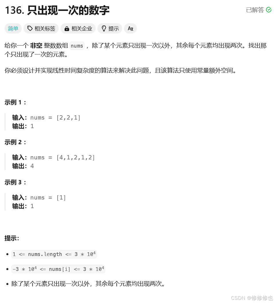 nums,除了某个元素只出现一次以外,其余每个元素均出现两次。找出那个只出现了一次的元素。 你必须设计并实现线性时间复杂度的算法来解决此问题,且该算法只使用常量额外空间。