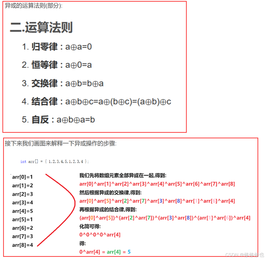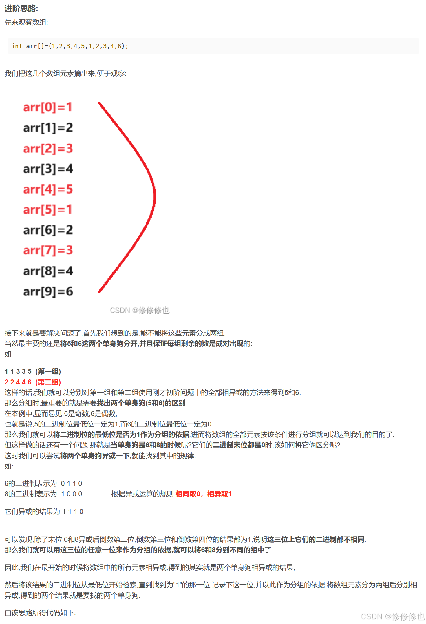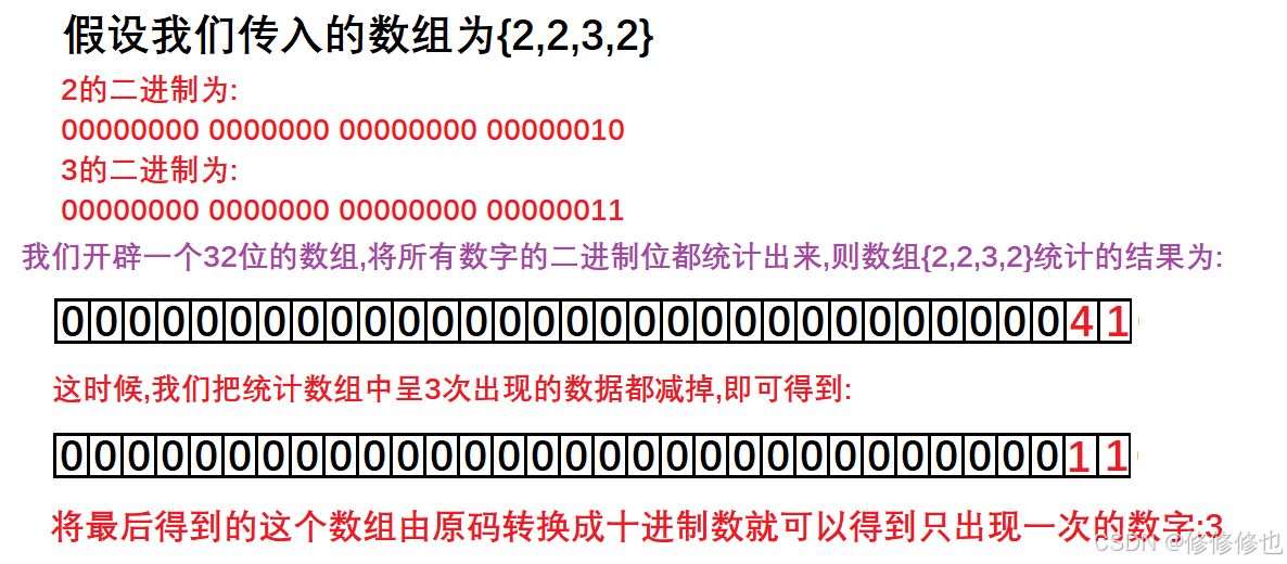 对于这种题目的异或解法详细原理原理我在之前有写过C语言版本,下图是文章中节选出的部分推理过程,感兴趣的朋友可以移步: 【C语言】找单身狗问题