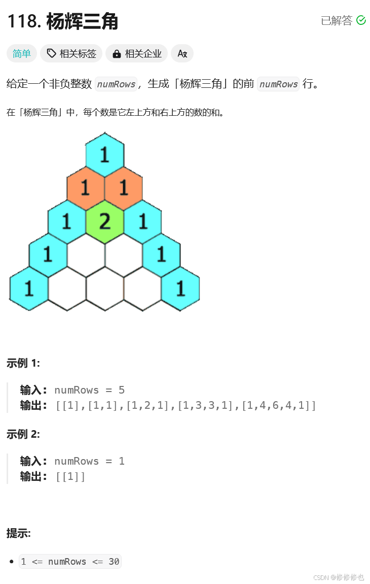 numRows,生成「杨辉三角」的前numRows行。 在「杨辉三角」中,每个数是它左上方和右上方的数的和。