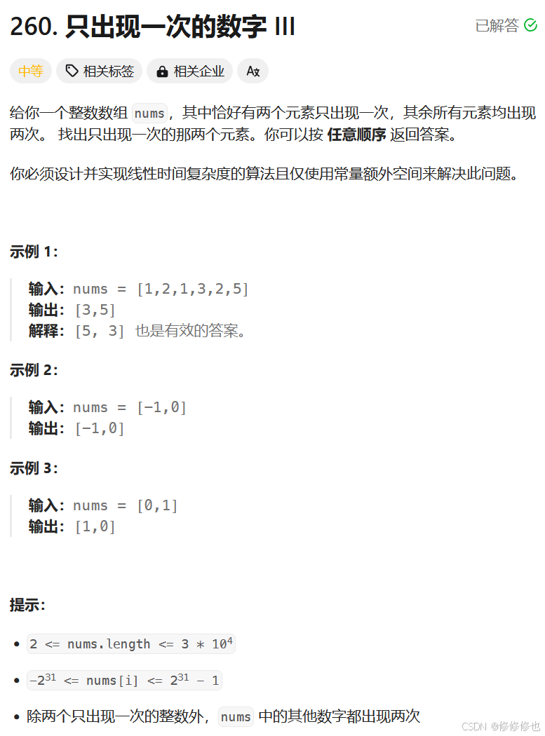 nums,其中恰好有两个元素只出现一次,其余所有元素均出现两次。 找出只出现一次的那两个元素。你可以按 任意顺序 返回答案。 你必须设计并实现线性时间复杂度的算法且仅使用常量额外空间来解决此问题。