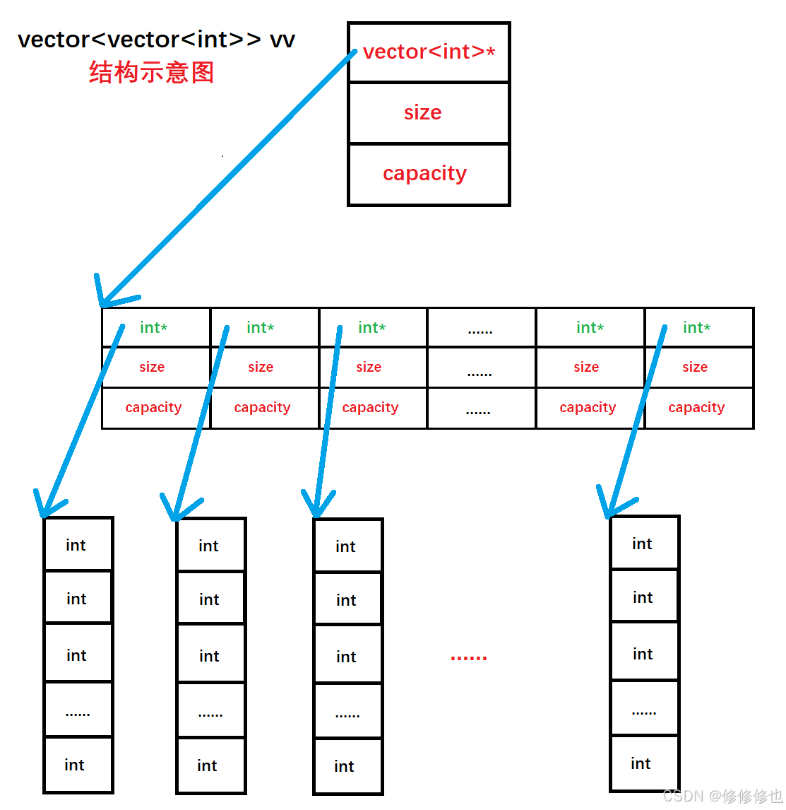 创建一个vector<vector<int>>的对象集合,集合中的元素是vector<int>.实际相当于一个二维数组,结构图示如下: