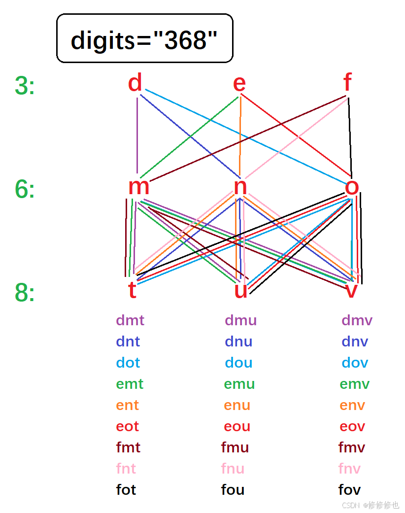 string strA[10]={"","","abc","def","ghi","jkl","mno","pqrs","tuv","wxyz"};其次我们通过画图可知,digits字符串有几个数字,我们的组合层数就会有几层,而每一层和下一层的组合逻辑都是相似的,所以我们可以尝试使用递归来将每一层组合出的字符组合在一起,这样直到递归到最后一层,就可以得到这次组合的结果,详细的过程见解题代码注释: