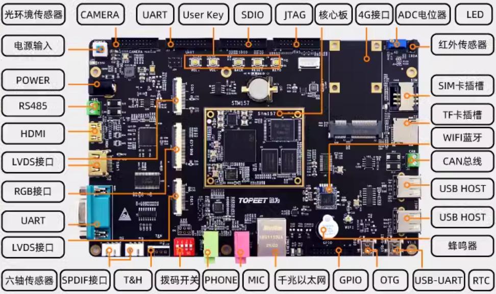 iTOP-STM32MP157开发板是基于意法半导体ST ARM双Cortex-A7核加单Cortex-M4核的一款多核异构处理器。Cortex-A7内核提供对开源操作系统Linux的支持,借助Linux系统庞大而丰富的软件组件处理复杂应用。M4 内核上运行对于实时性要求严格的应用。