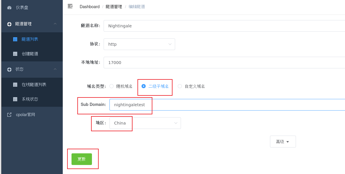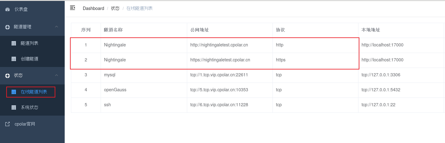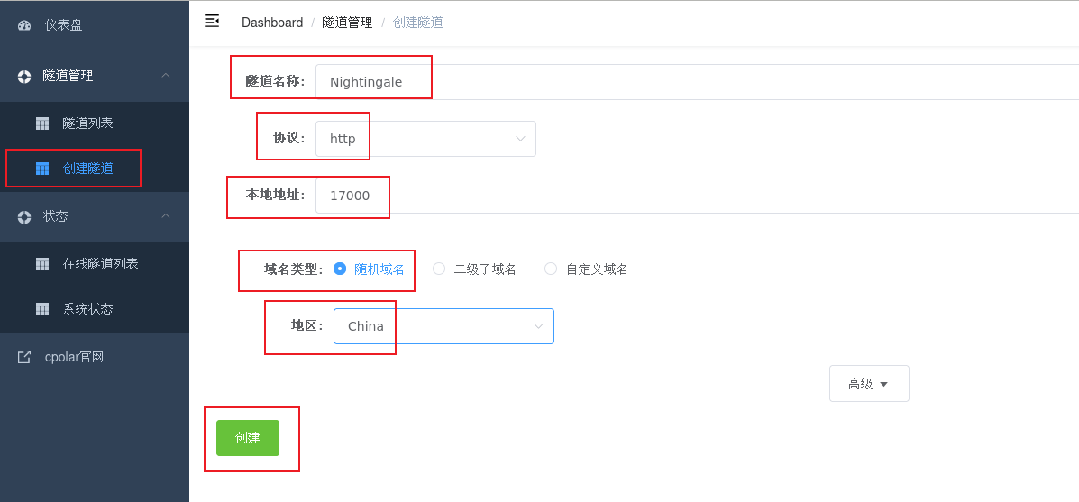 点击左侧仪表盘的隧道管理——创建隧道,创建一个Nightingale的cpolar隧道!