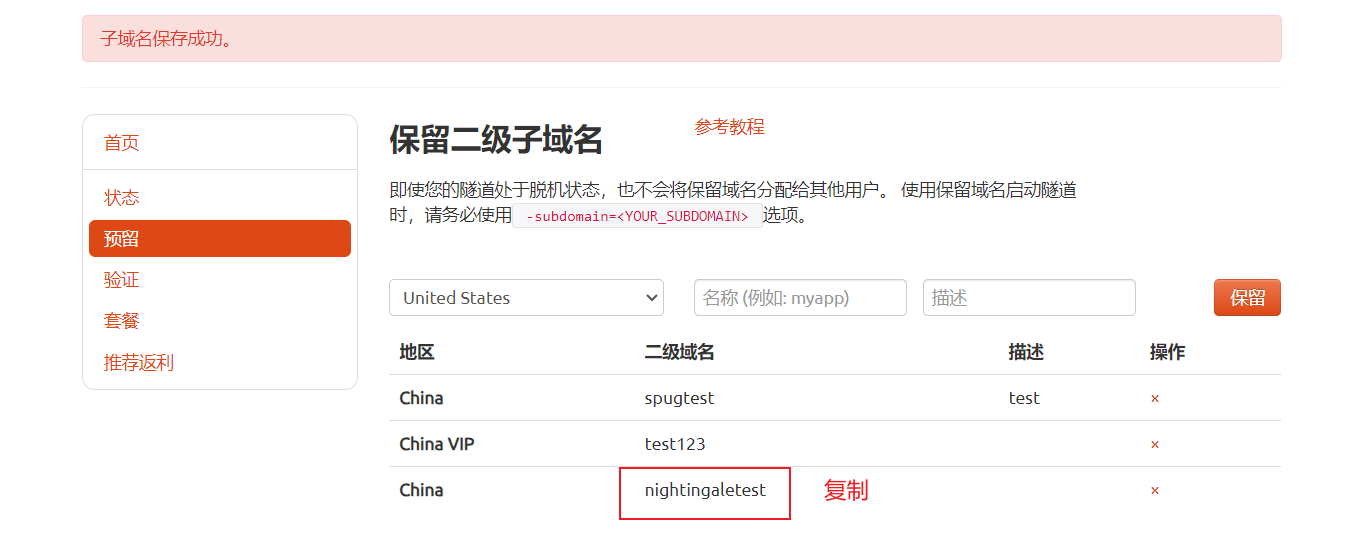 保留成功后复制保留成功的二级子域名的名称