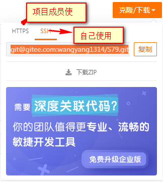 7.根据不同情况使用不用链接,项目成员HTTPS,主人使用SSH和HTTPS都可以