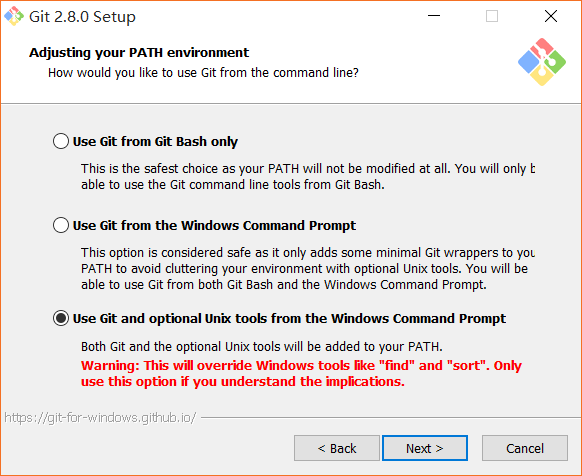 4.选择:use git and optional unix tools from the windows command prompt(红字提示)