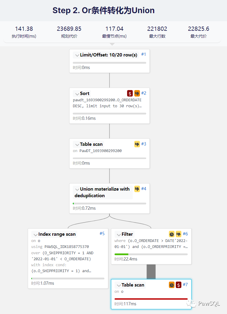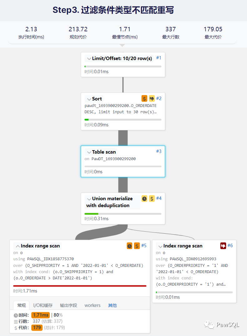 CREATE INDEX PAWSQL_IDX1858775370 ON tpch.orders(O_SHIPPRIORITY,O_ORDERDATE); CREATE INDEX PAWSQL_IDX0912695993 ON tpch.orders(O_ORDERPRIORITY,O_ORDERDATE);优化效果: 我们可以看到SQL并没有按照预期性能提升,反而执行时间更久了,根据下面的执行计划分析我们看到第二个子查询并没有按照预期走索引(PAWSQL_IDX0912695993),反而是进行了全表扫描,执行时间变为141.38ms,性能大大降低。我们需要分析一下为什么没有按照预期走索引。