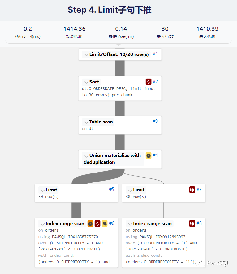 limit子句拷贝粘贴到各个SQL的分支,需要将offset转移到limit上。即把limit 20, 10转化为limit 30limit子句下推,最终的执行时间降低为0.2ms,相比较第三步提升10倍。整个优化流程走下来,执行时间从149ms降低到0.2ms,性能提升了700多倍。