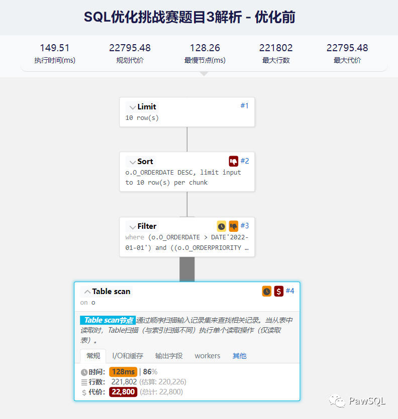 orders表总共20+w行,o_orderdate)在2021-01-01至2023-01-01基本均匀分布o_orderpriority=1的筛选率在5%左右,O_ORDERDATE>'2022-01-01',筛选率在0.1%左右;o_shippriority=1筛选率0.1%。表orders除了主键,其他列上无索引。从执行计划可以看到,会进行全表扫描,执行时间为149.51ms,其中全表扫描花费了128ms,占总执行时间的84%,需重点优化。