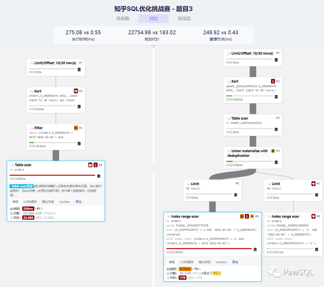 下图是优化前后执行计划以及执行时间的对比,可以看到最终执行时间降低为原来的1/500,性能提升了500倍!本文详述其优化过程,同时一探PawSQL引擎内部优化机制。