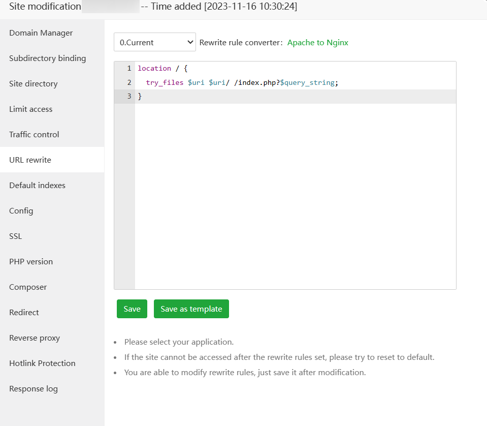 在设置页面中,找到伪静态,将以下内容复制进去,然后保存。