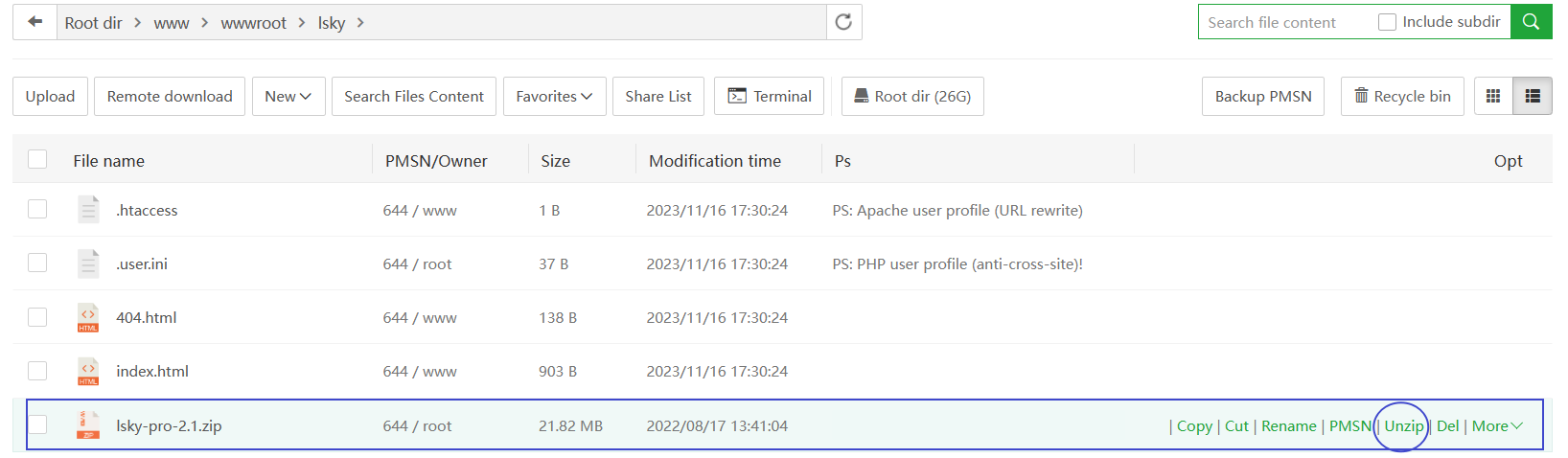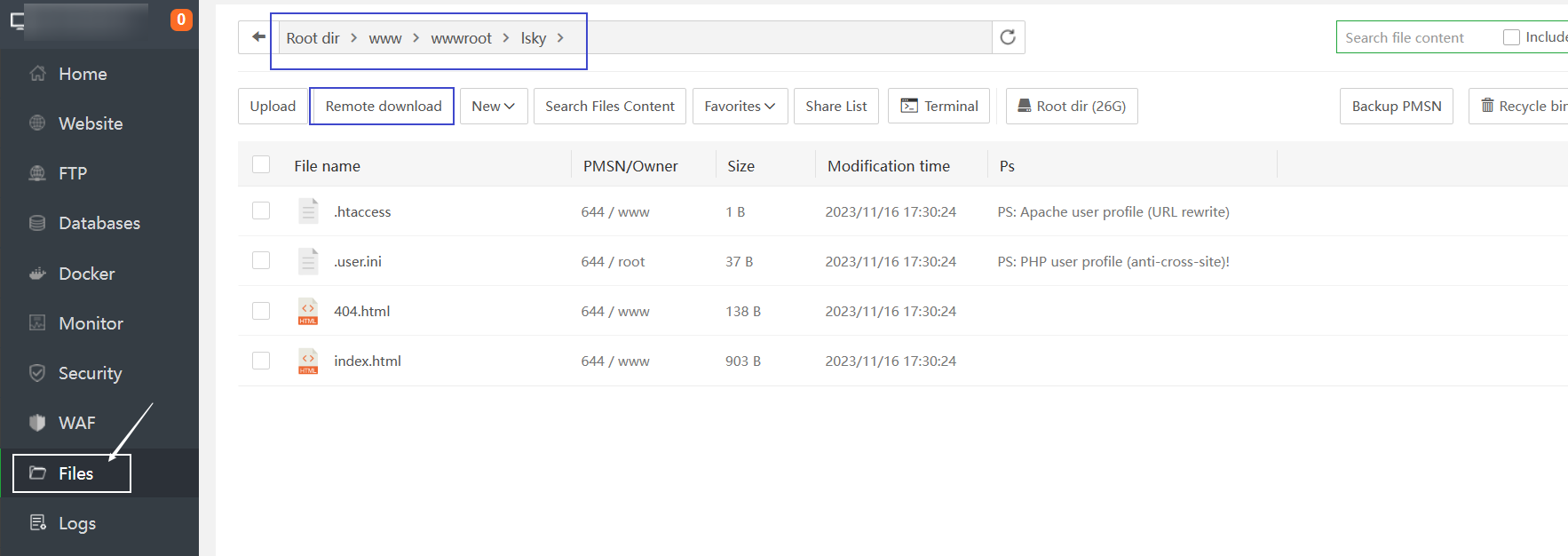 我们进入网站目录,点击remote download进行远程下载。
