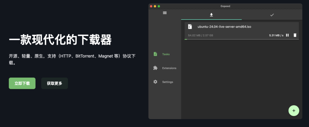 Gopeed 是一款由 Golang 和 Flutter 开发的现代化多平台高速下载器,支持 HTTP、Bittorrent、Magnet 等协议。