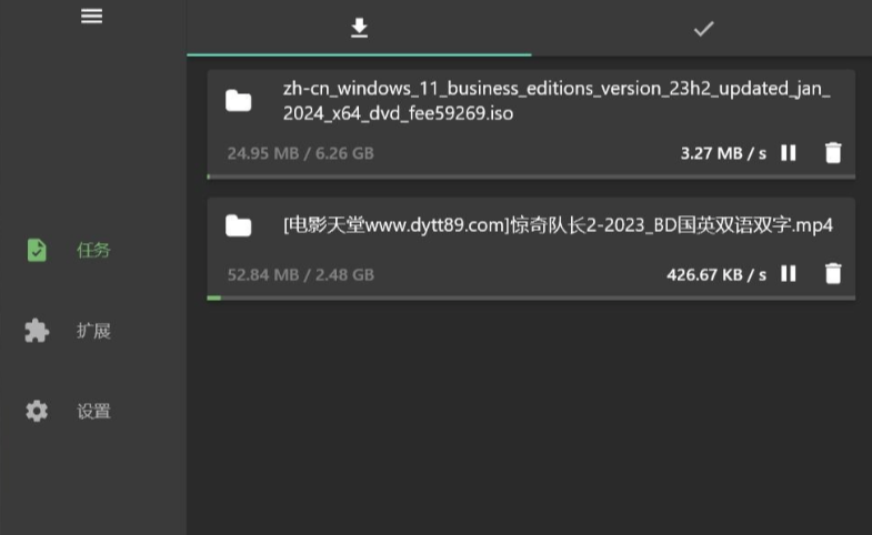Gopeed 的界面设计遵循 Material Design 规范,简单美观,支持暗黑主题,左右布局,左侧是功能栏目,右侧是下载详情,操作直观且体验良好。